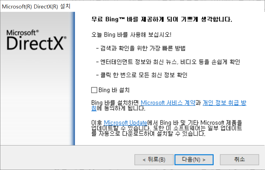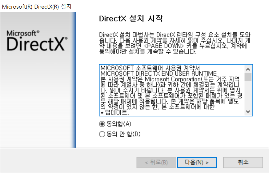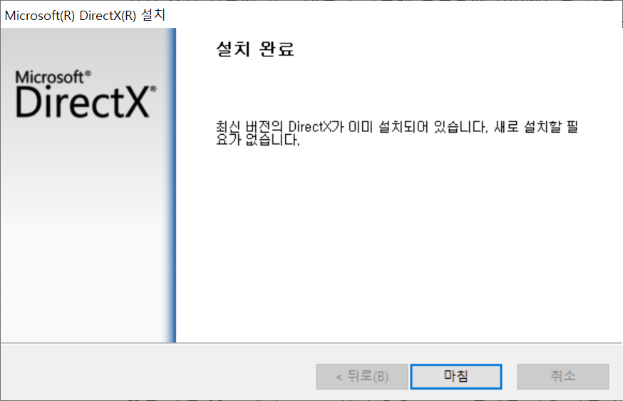 설치 시 "Windows 10 Ver1809(RS5)에서 MS Office(Ver 1810)가 DirectX 설치에 필요한 .dll 파일을 손상시켜 발생할 수 있습니다. "라는 에러가 발생합니다.