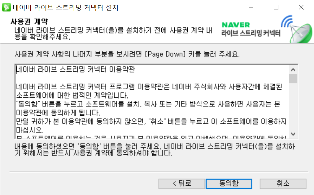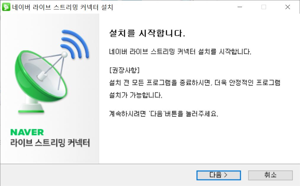 3. 잠시 후 네이버 '라이브 스트리밍 커넥터 설치 클라이언트'가 실행되면 '다음'을 클릭해 설치를 진행합니다.