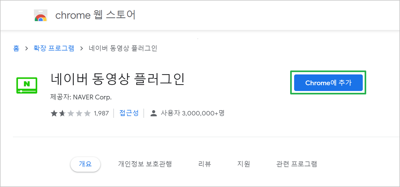 6. 마지막으로 사용할 브라우저로 접속해 '네이버 동영상 플러그인'을 설치합니다. [chrome에 추가 - 확장 프로그램 추가]