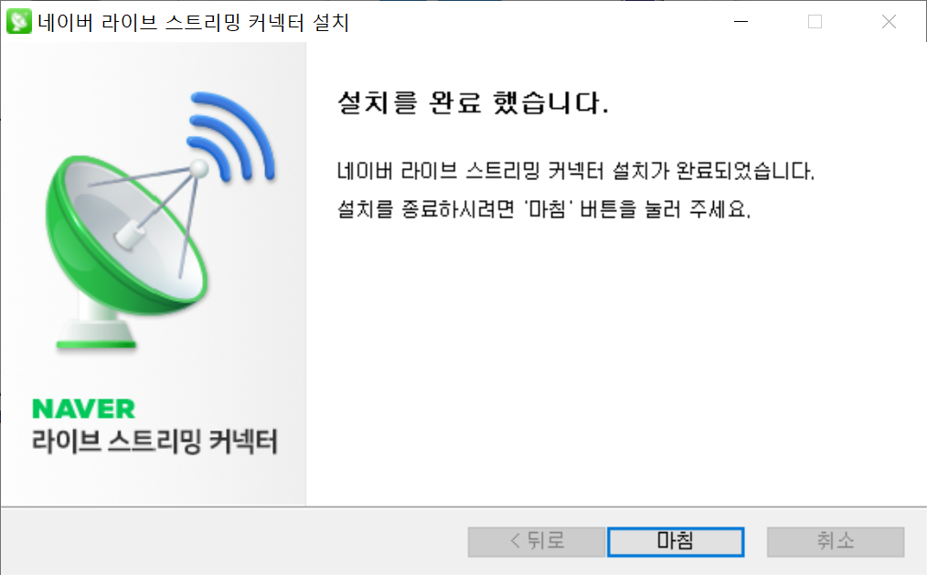 5. 네이버 라이브 스트리밍 설치가 모두 완료되면 '마침'을 클릭해 마무리합니다.