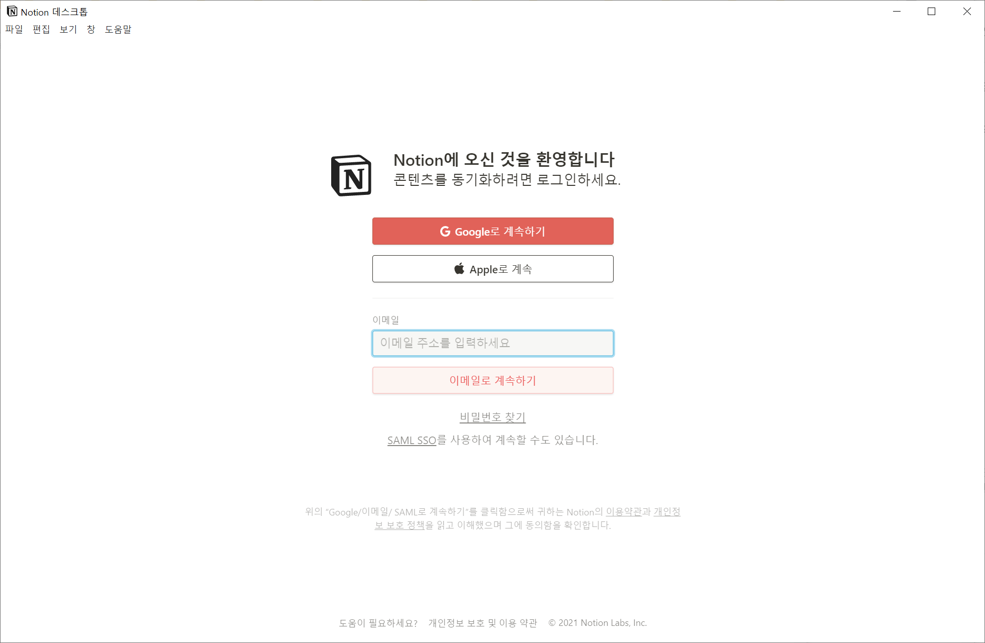 3. Notion 프로그램 설치가 모두 완료되면 구글 및 애플 아이디를 사용해 로그인하거나 계정을 무료로 생성합니다.