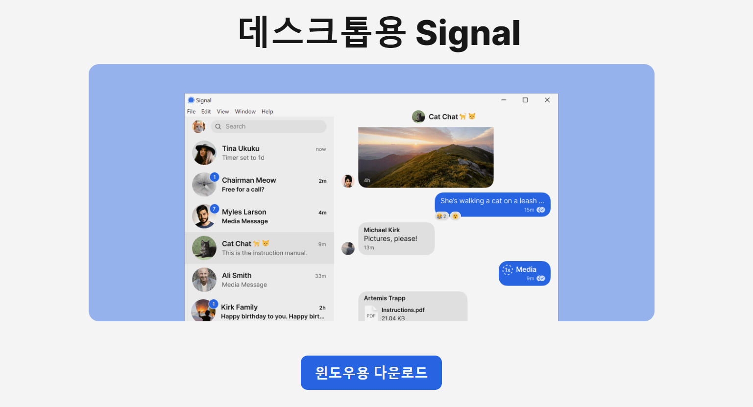 - 시그널 메신저는 안드로이드, 아이폰, 윈도우, 맥 운영체제에서 지원