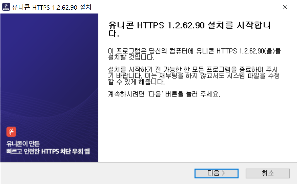 하마치 프로그램이 사전에 설치되어 있다면 유니콘 HTTPS 프로그램 설치 시 동작 안됨 또는 불가 문제가 발생할 수 있습니다. 해당 프로그램을 제거 후 실행하시길 바랍니다.