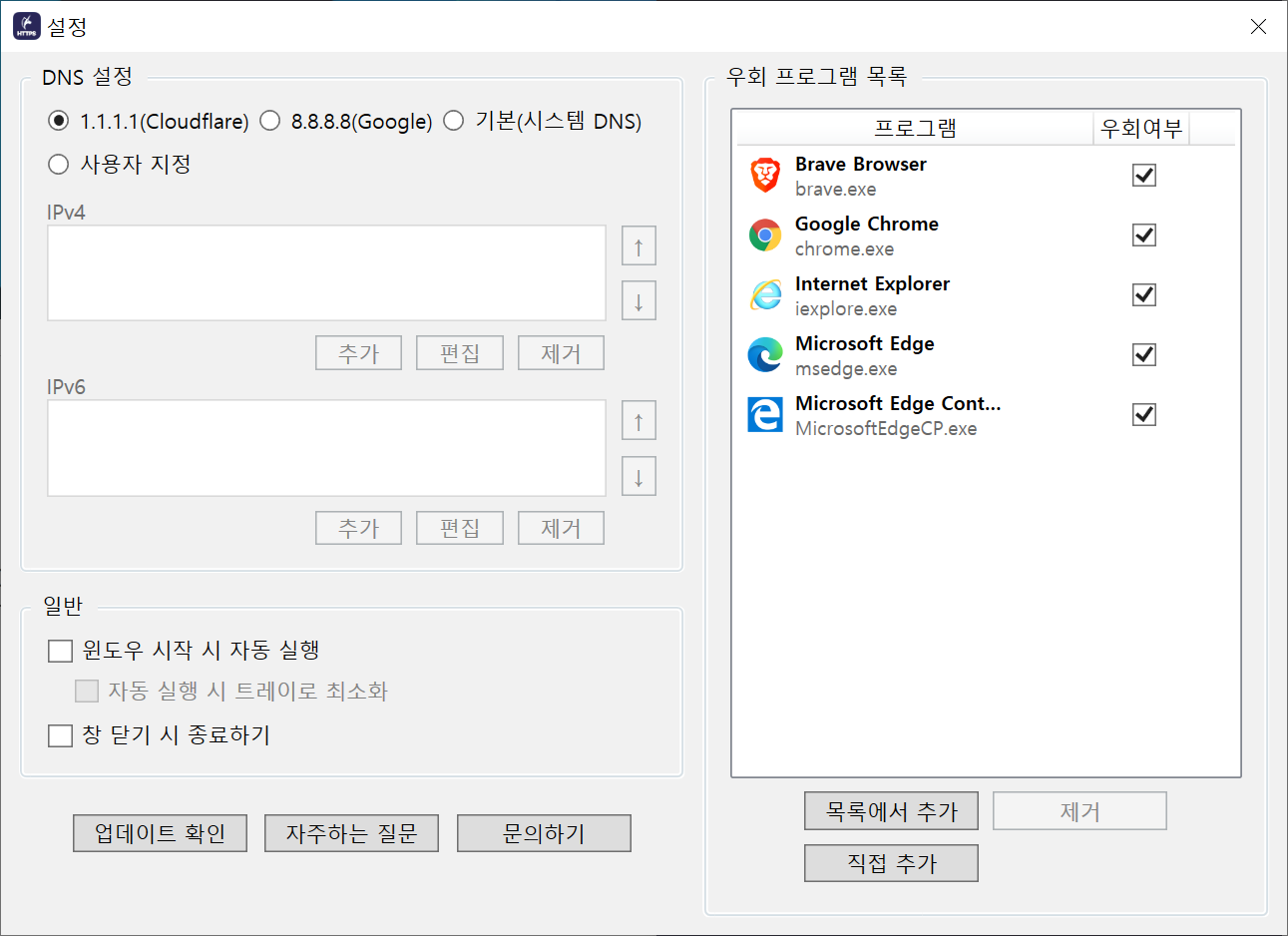 설정으로 들어가 DNS 설정 및 우회 프로그램 목록을 변경할 수 있습니다. 도메인 주소를 IP로 변경해주는 서브를 DNS라 하며 대한민국의 대부분의 인터넷 사용자는 통신사(LG, KT, SKT)에서 제공하는 DNS 서버를 사용하고 있습니다.