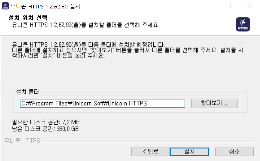 잠시 후 유니콘 HTTPS 설치 클라이언트가 실행됩니다. 설치할 프로그램의 버전 정보를 확인한 뒤 설치경로를 지정해 줍니다. (해당 프로그램은 원활하게 사용하기 위해서는 최소 7.2MB의 디스크 공간이 필요합니다.)