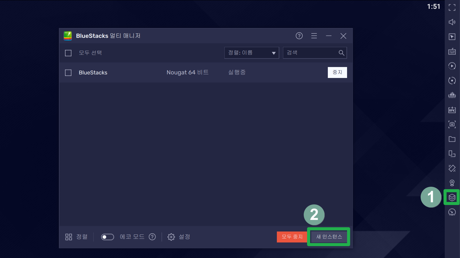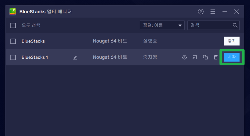 4. 이제 '시작'을 클릭해 방금 생성된 새로운 인스턴스 'BlueStacks1'을 실행합니다.