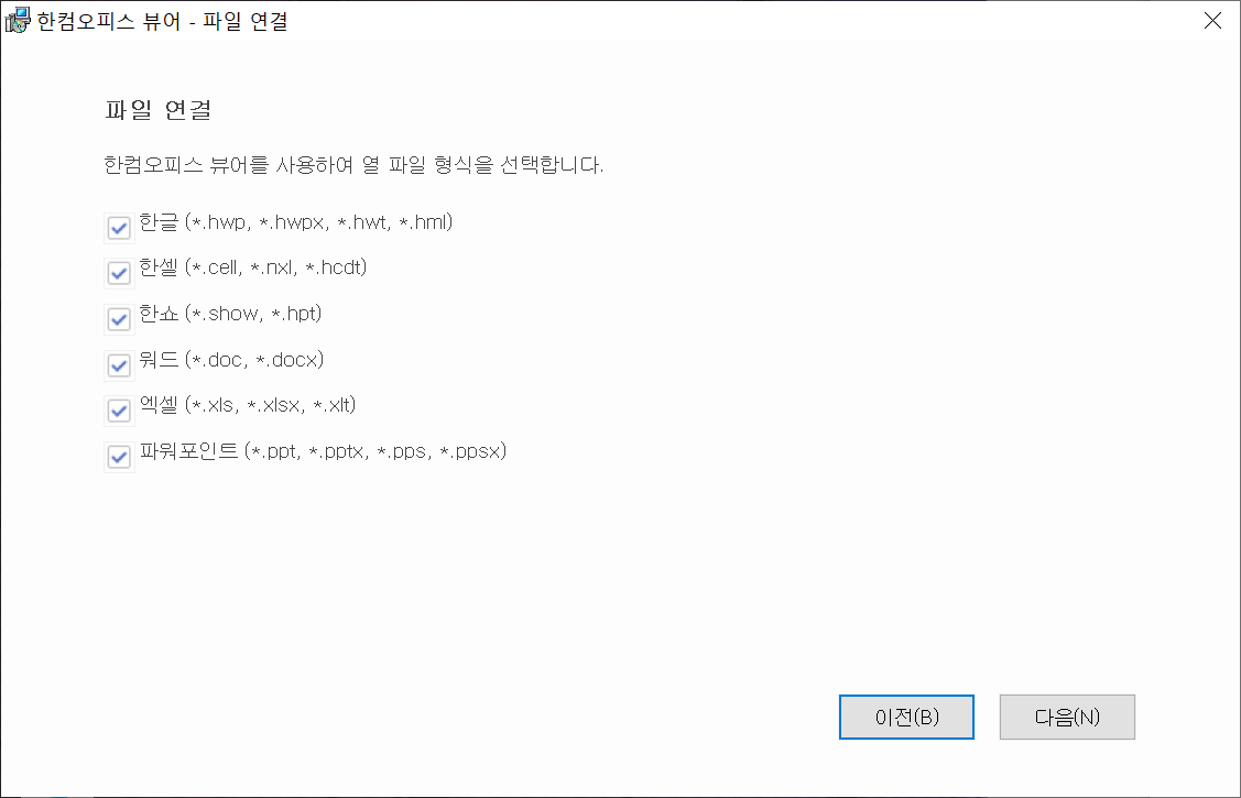 4. 한글 뷰어에 연결할 파일의 확장자를 모두 선택합니다.