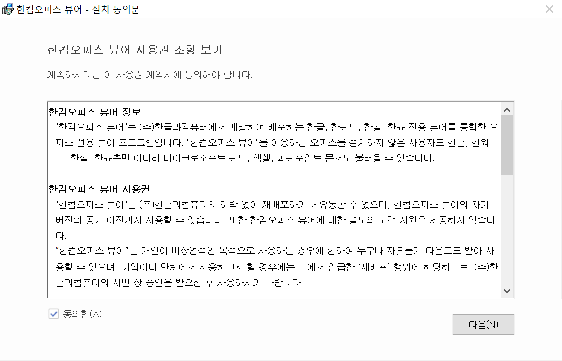 2. 한컴오피스 뷰어 설치 클라이언트가 실행되면 다음을 클릭해 설치를 진행합니다.