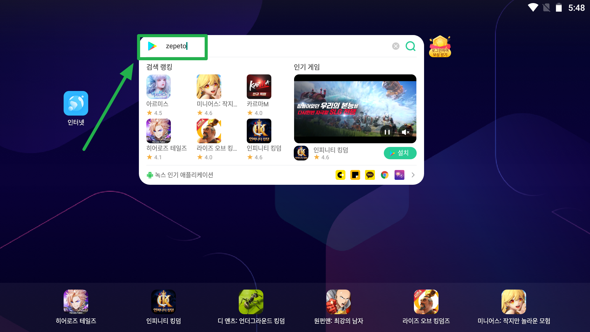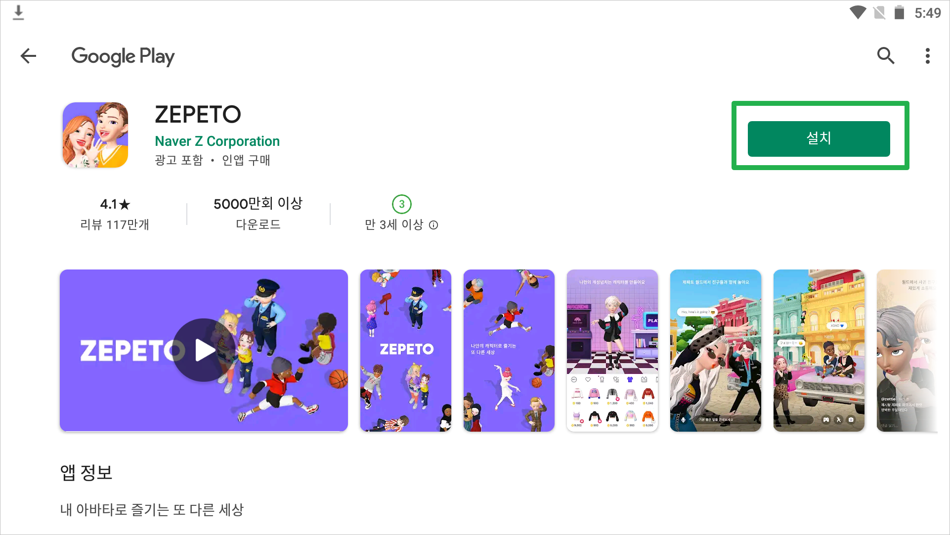 4. 'Google Play' 검색 창에 'ZEPETO'를 검색해 설치합니다.